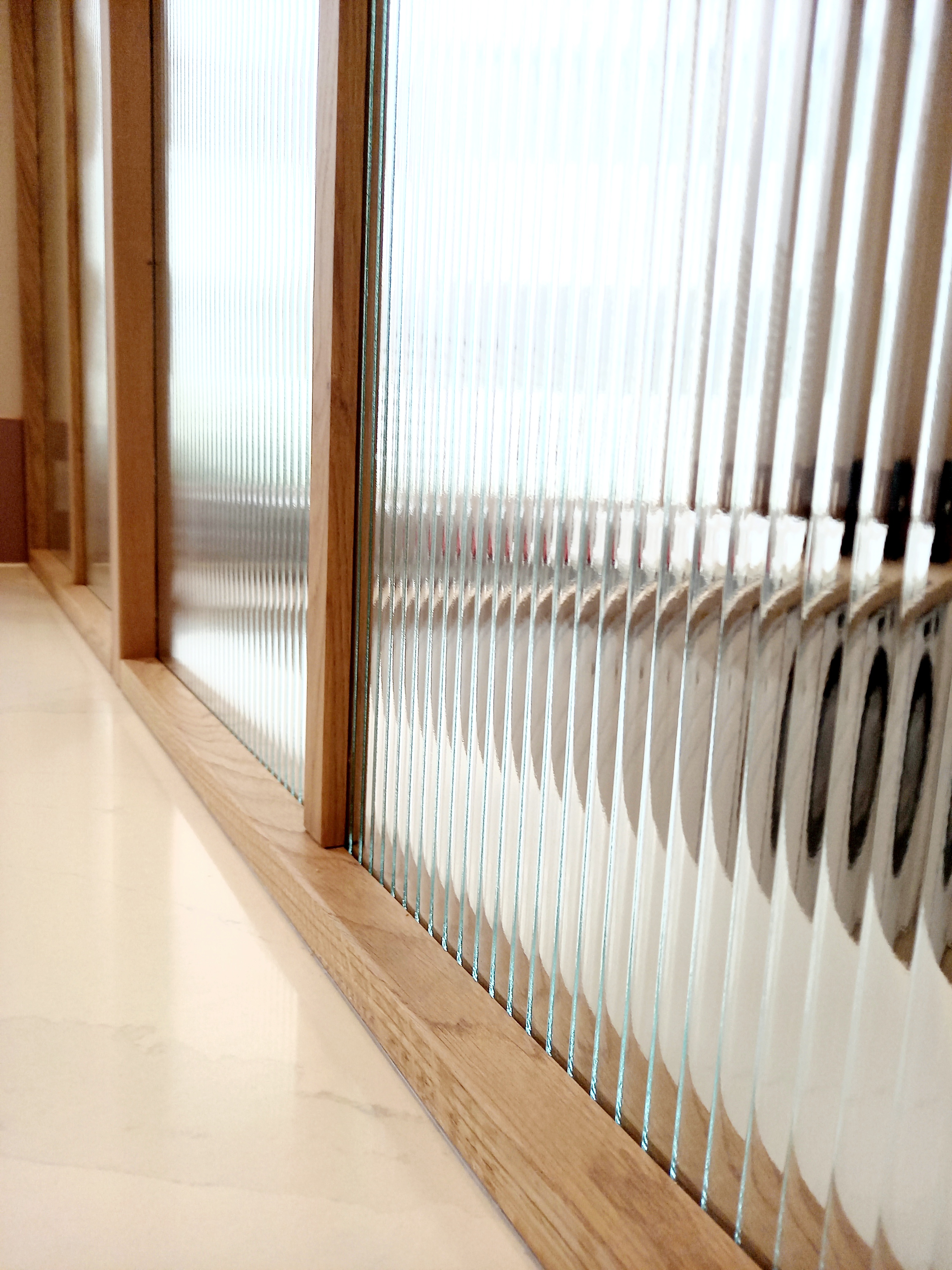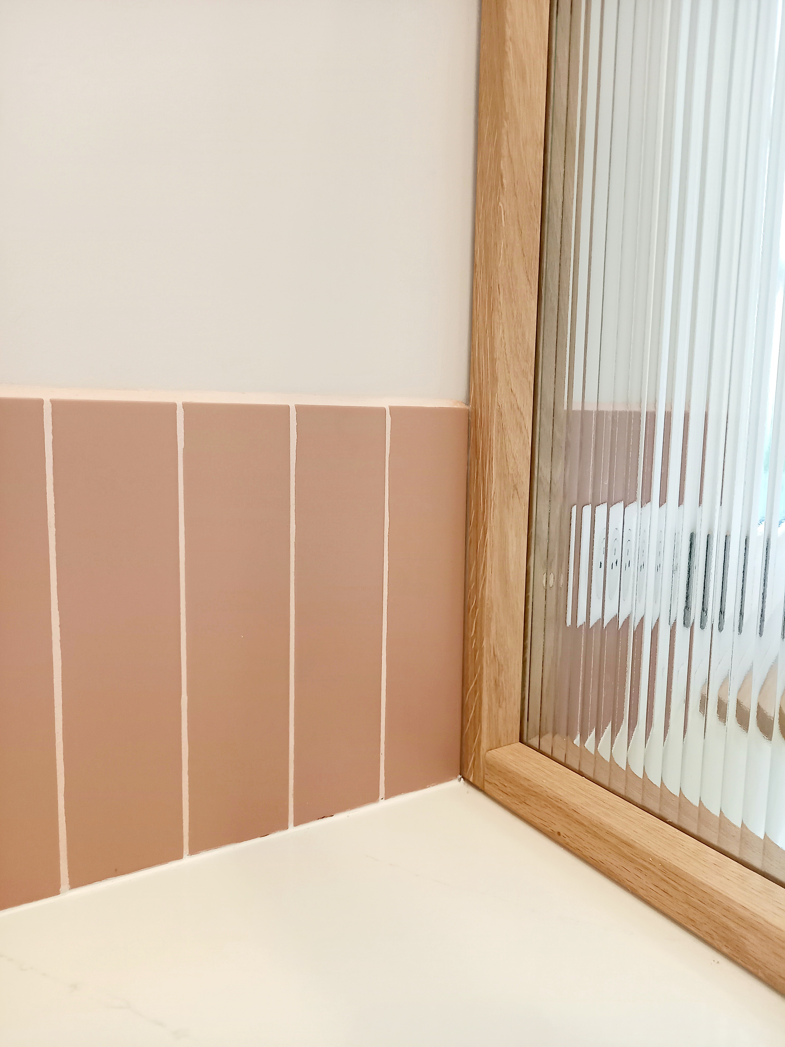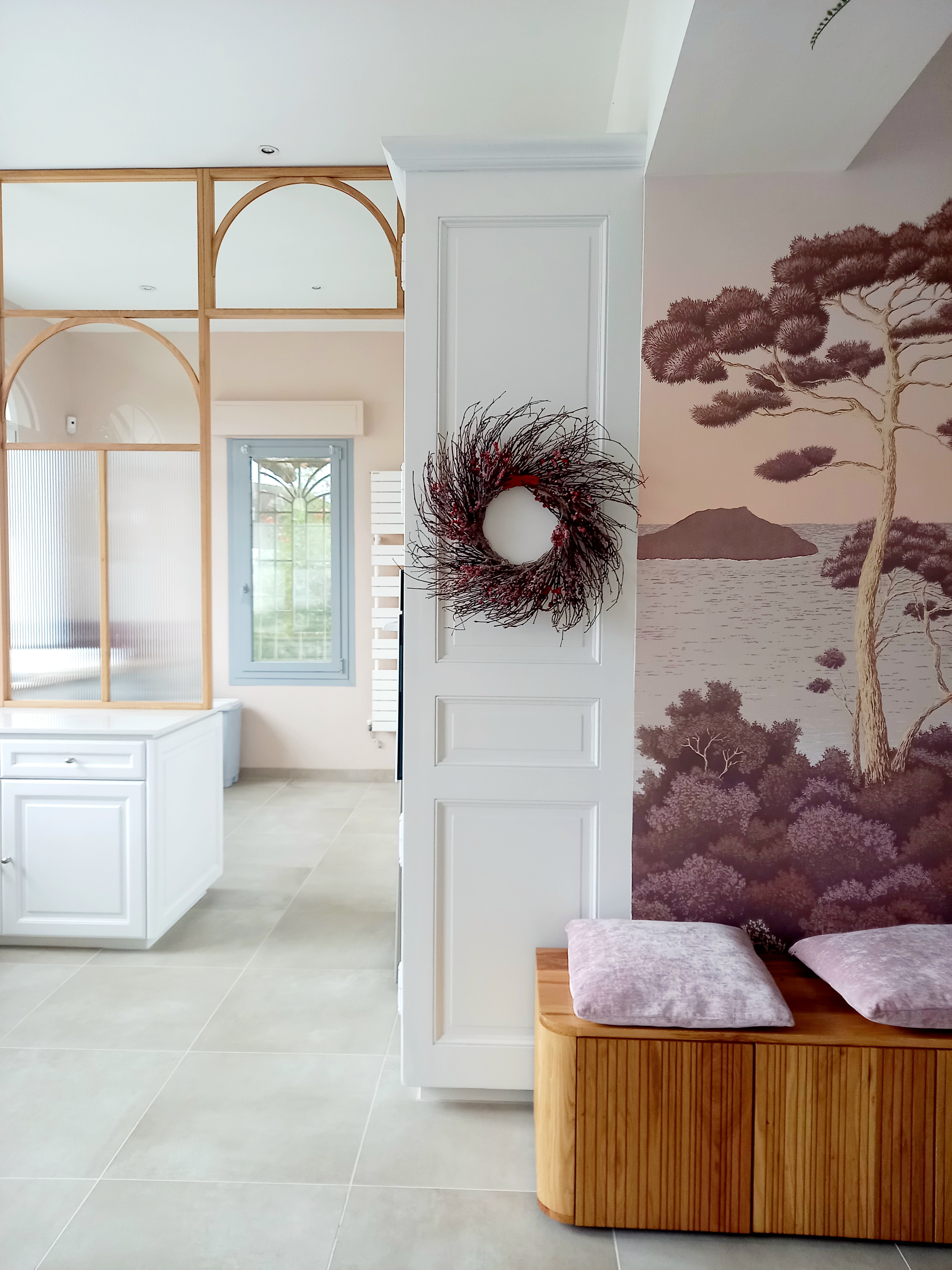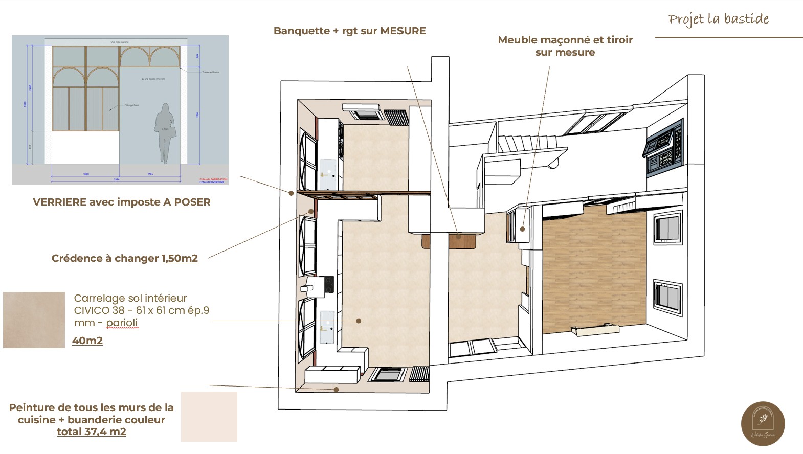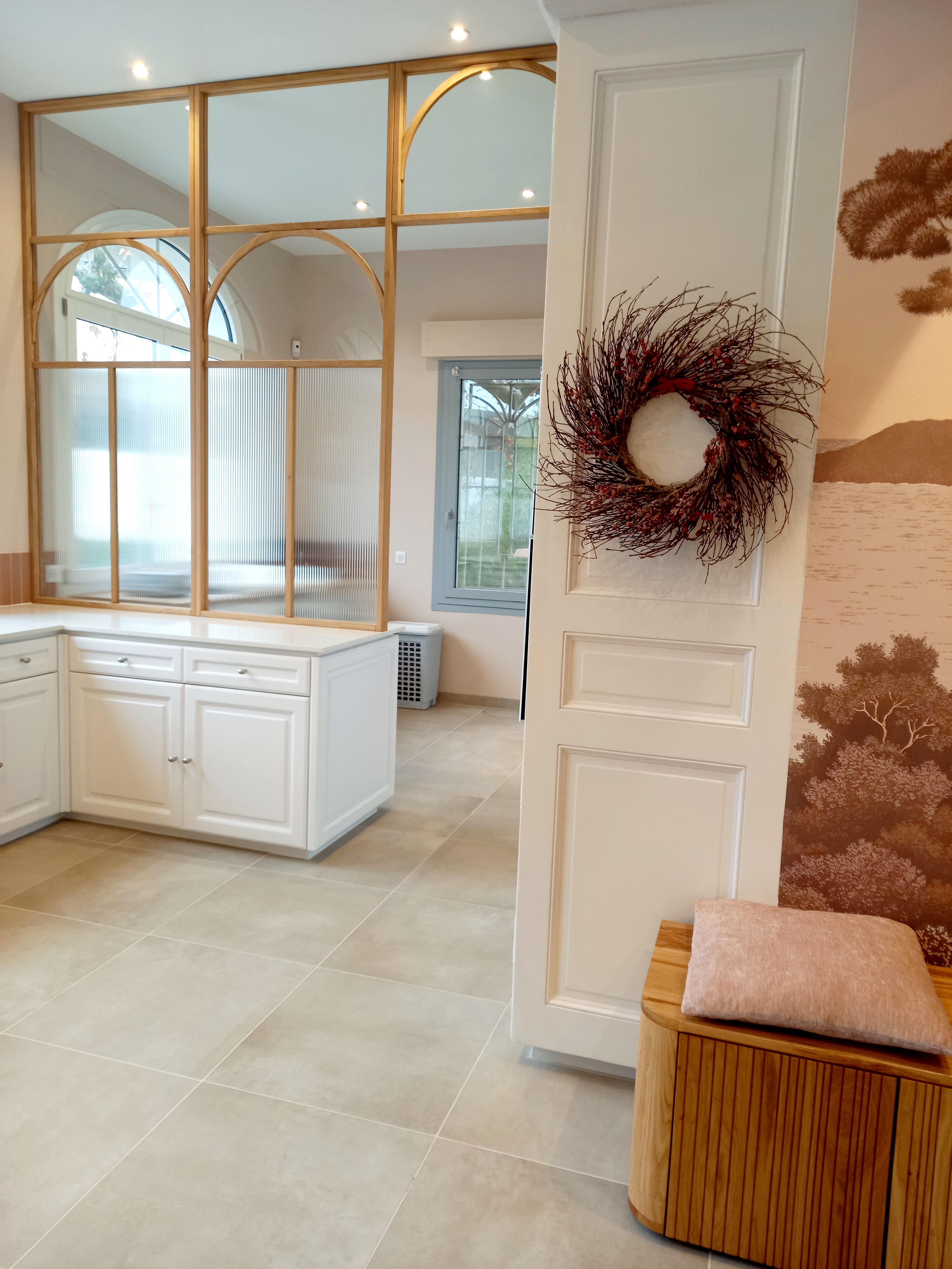 Le projet a permis de réorganiser et de valoriser un grand espace cuisine/buanderie avec la création d'une verrière sur mesure en chêne massif avec verre fluté, dessinée sur-mesure.