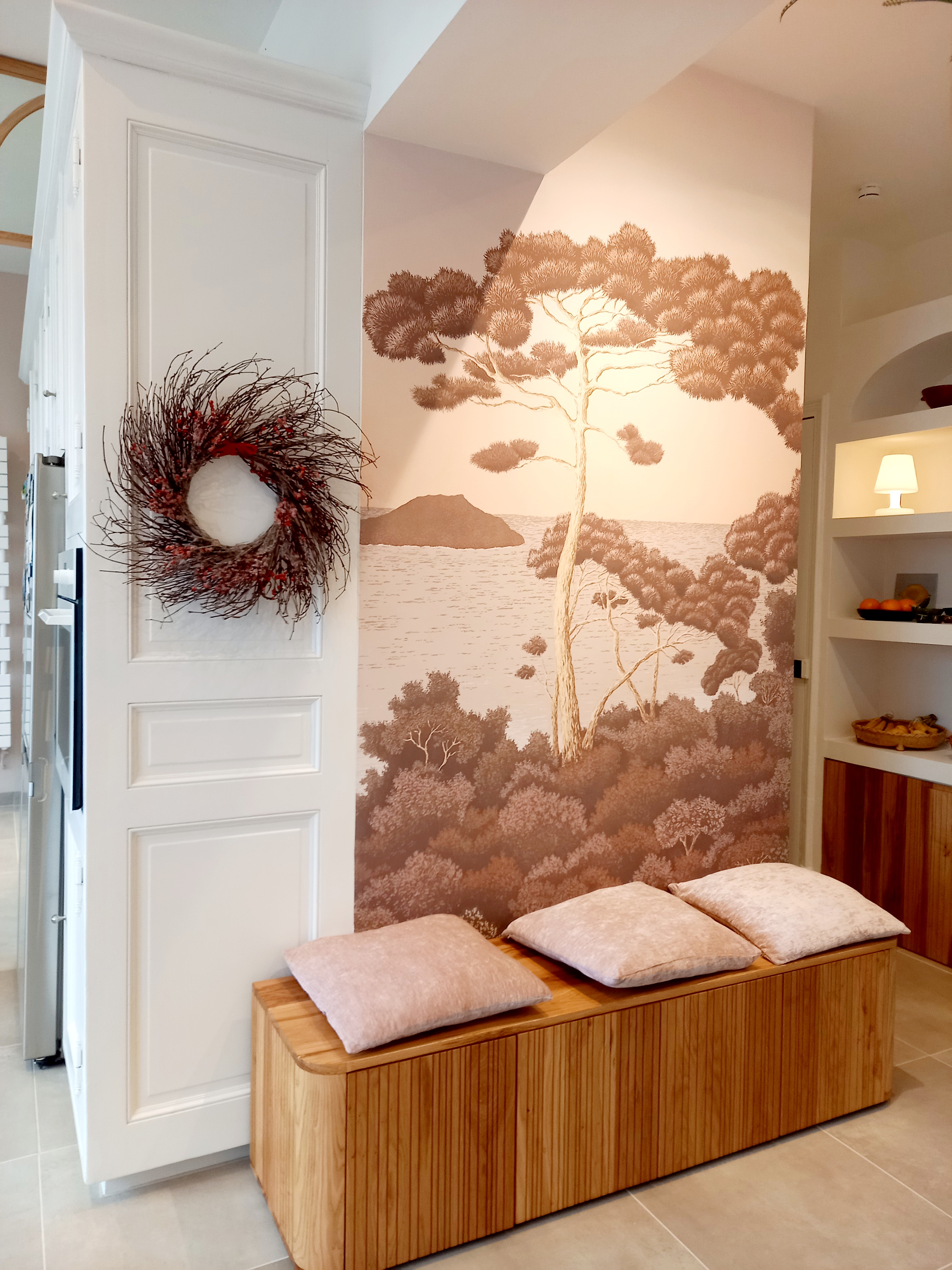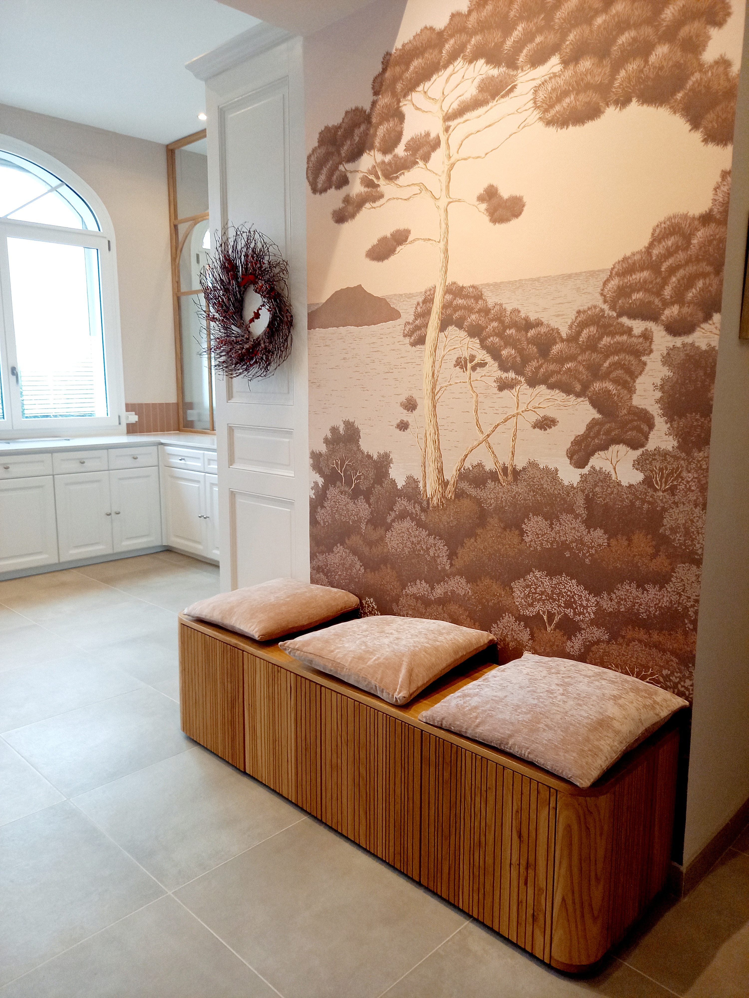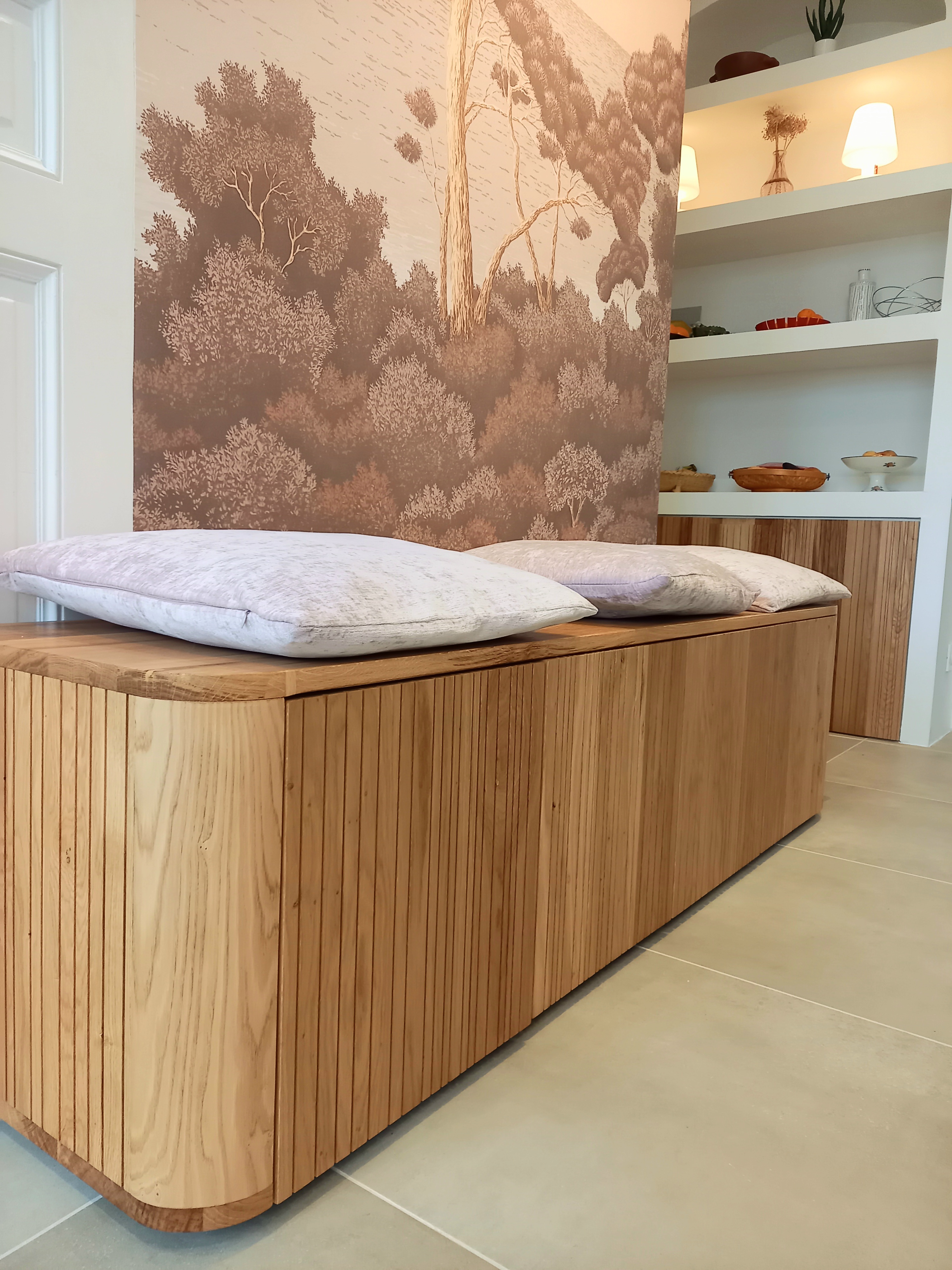 Une banquette sur mesure avec tiroir et un meuble maçonné ont été réalisés par un menuisier local. Le papier peint Isidore Leroy Port Cros apporte une note végétale et méditerranéenne à l'ensemble.