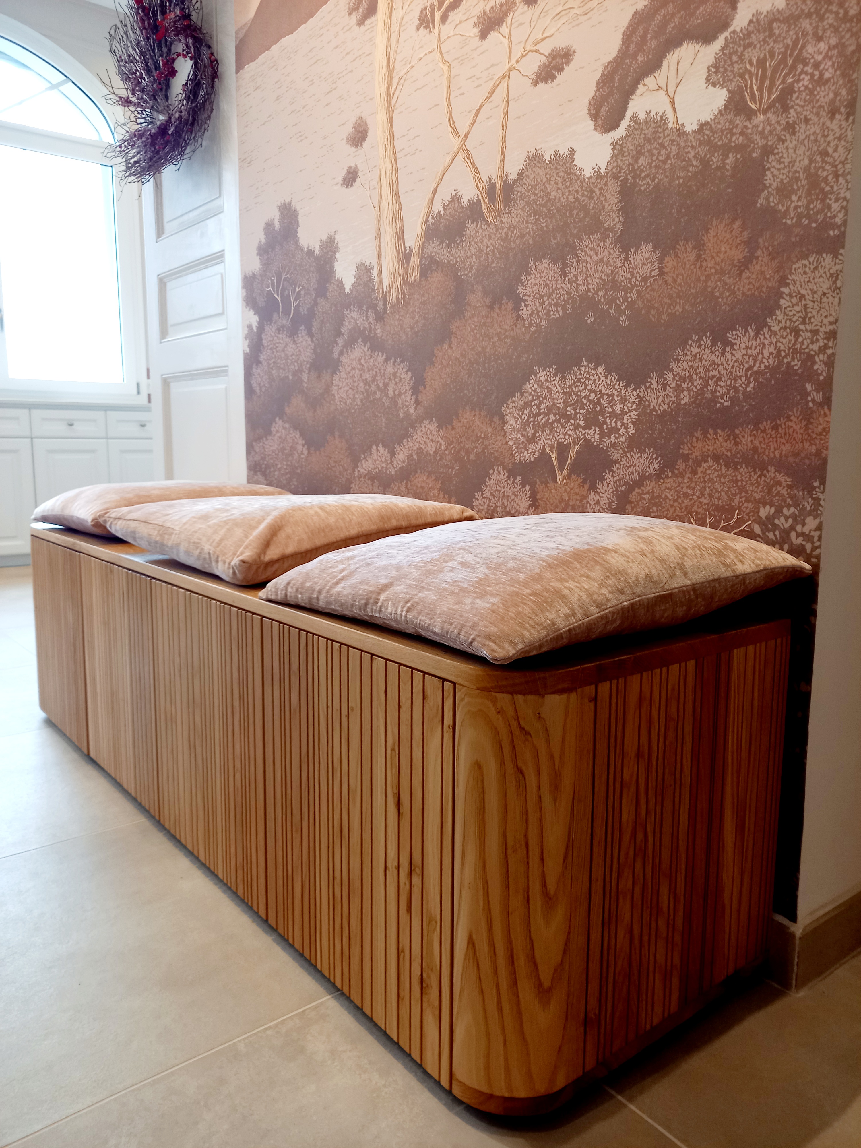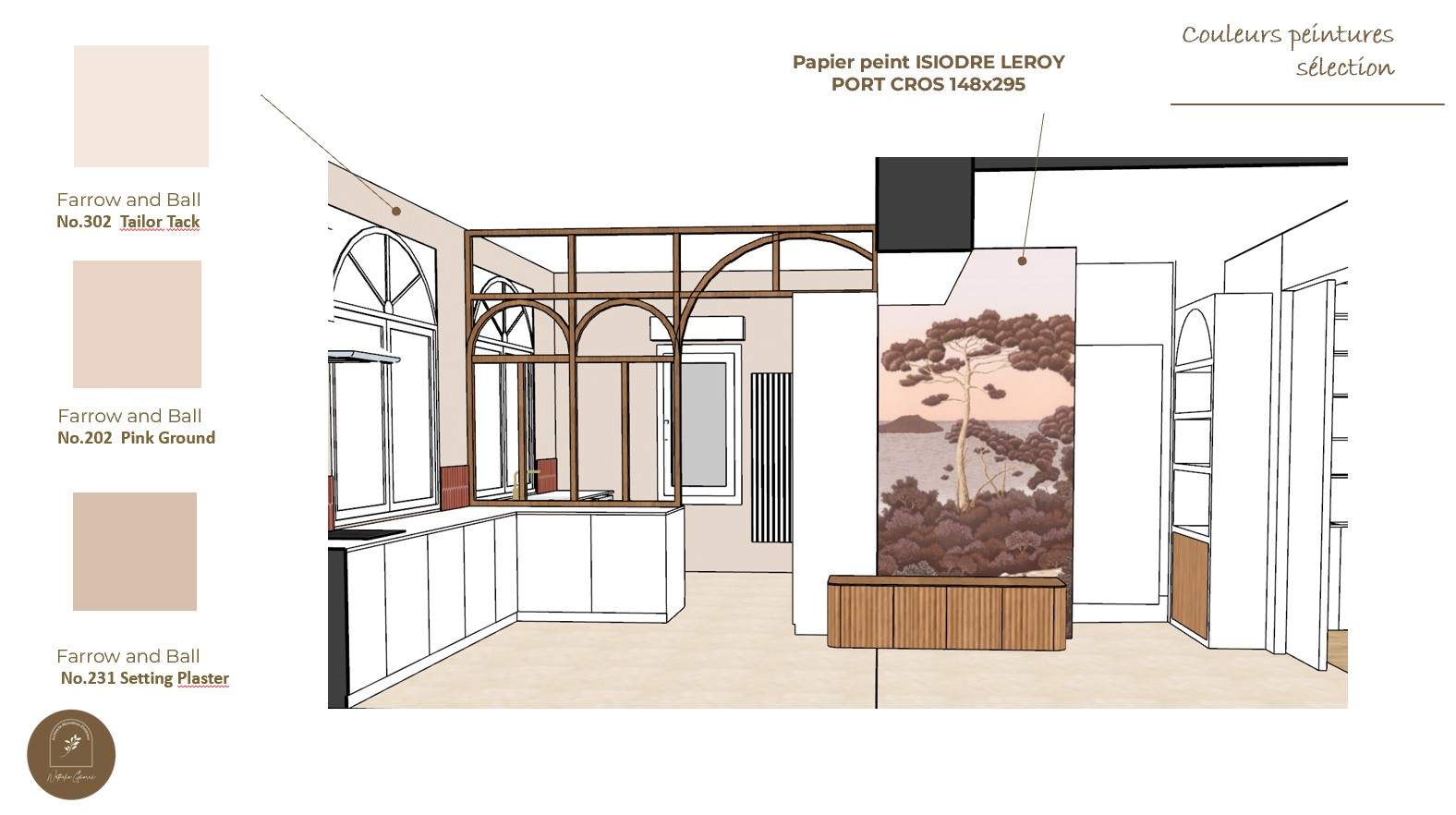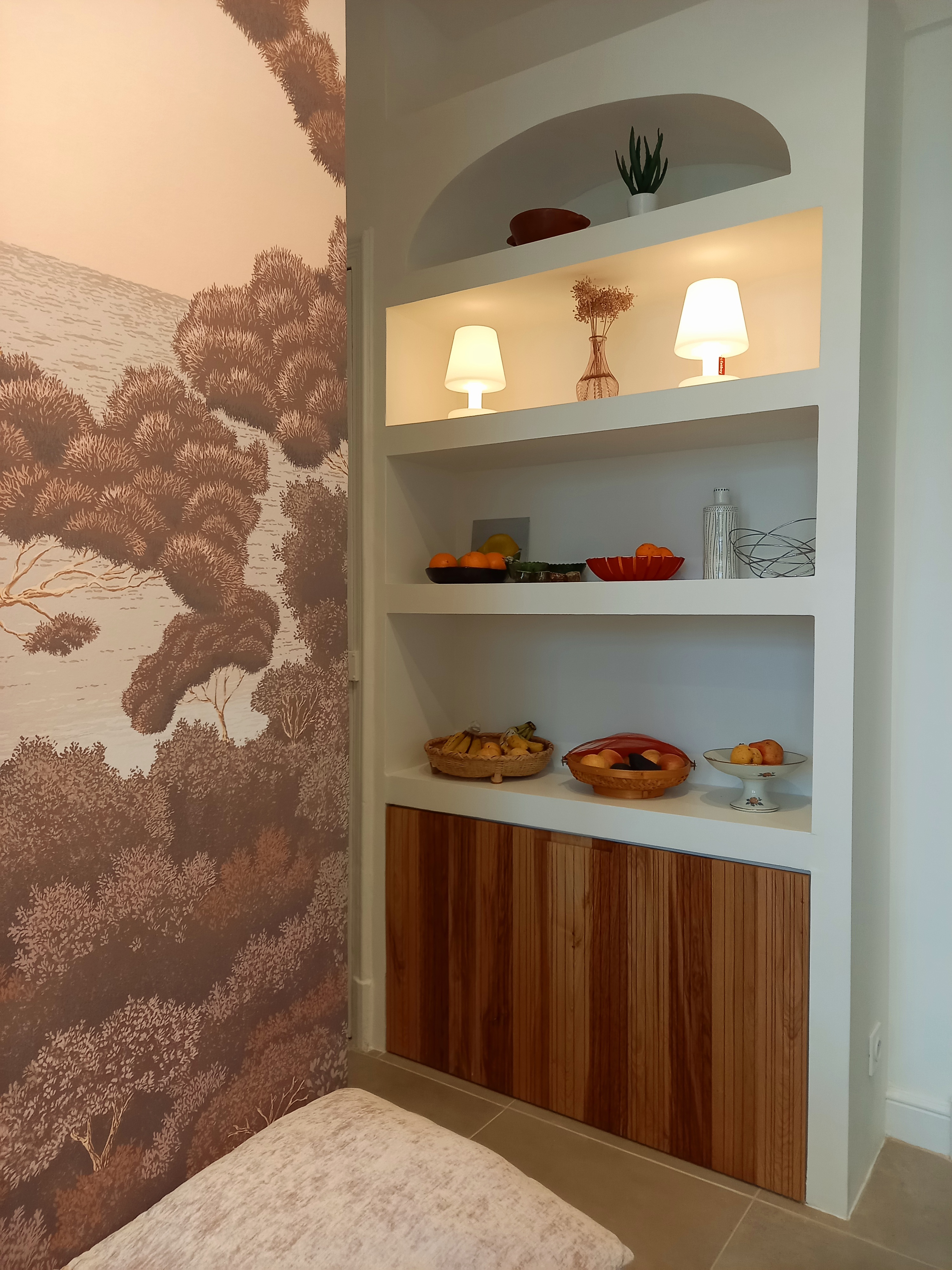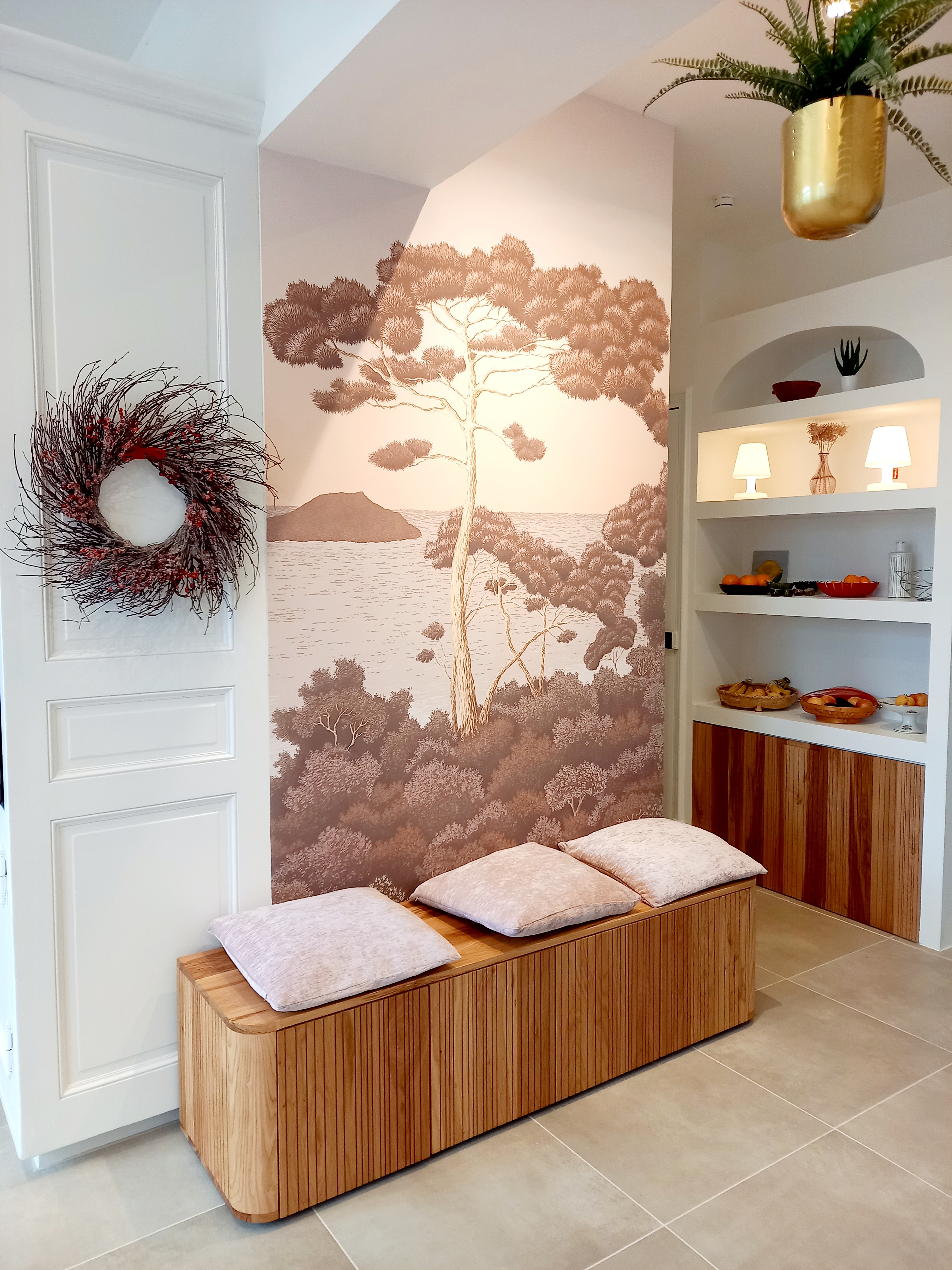 Une banquette sur mesure avec tiroir et un meuble maçonné ont été réalisés par un menuisier local. Le papier peint Isidore Leroy Port Cros apporte une note végétale et méditerranéenne à l'ensemble.