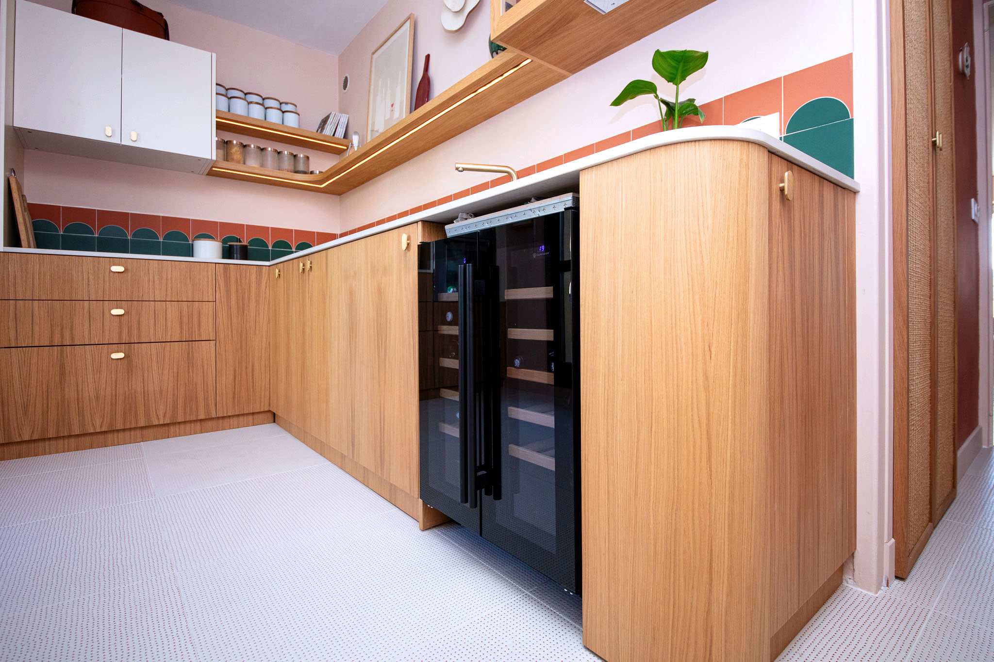 Le plan de travail est réalisé en Dekton sur mesure. Le sol et la crédence, aux carreaux designer, apportent caractère et singularité à l'espace.