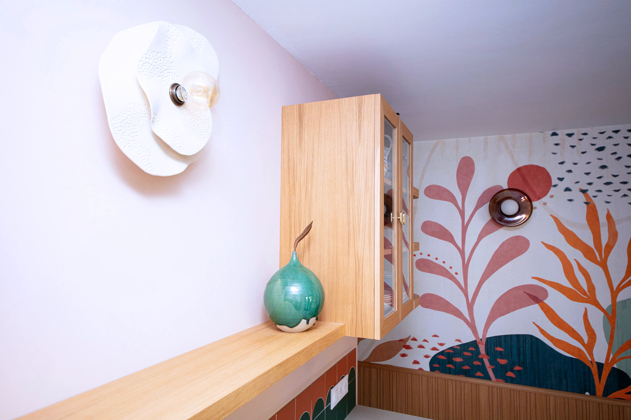 L'éclairage est soigné avec une applique artisanale en grès cérame créée par une artisane marseillaise.