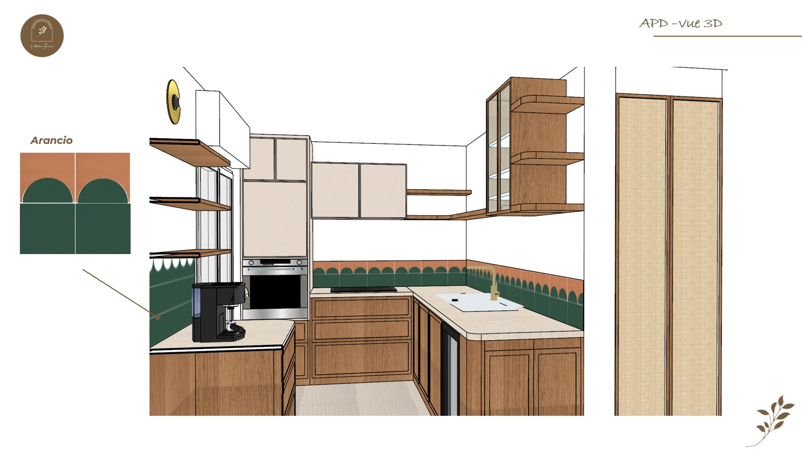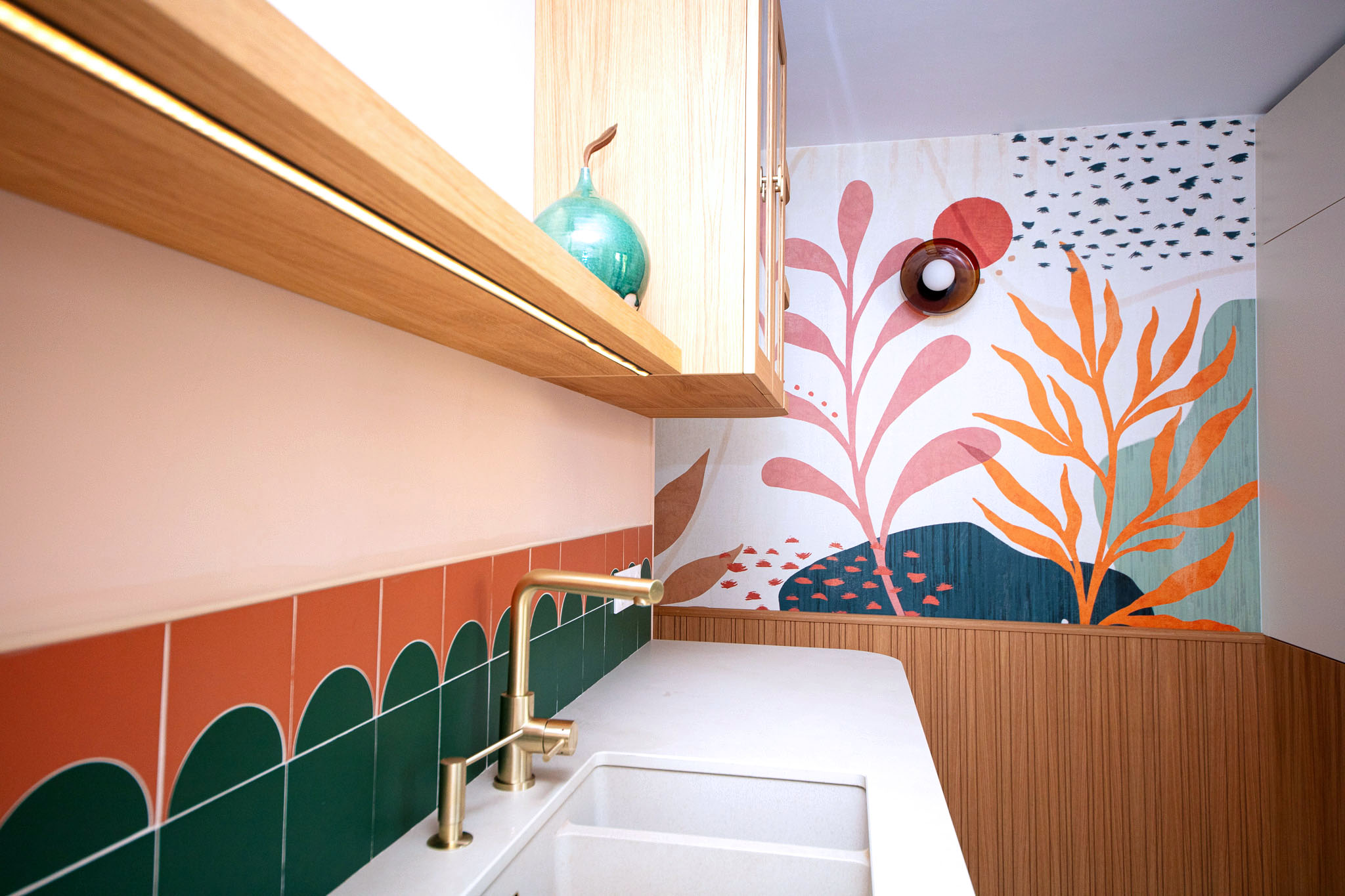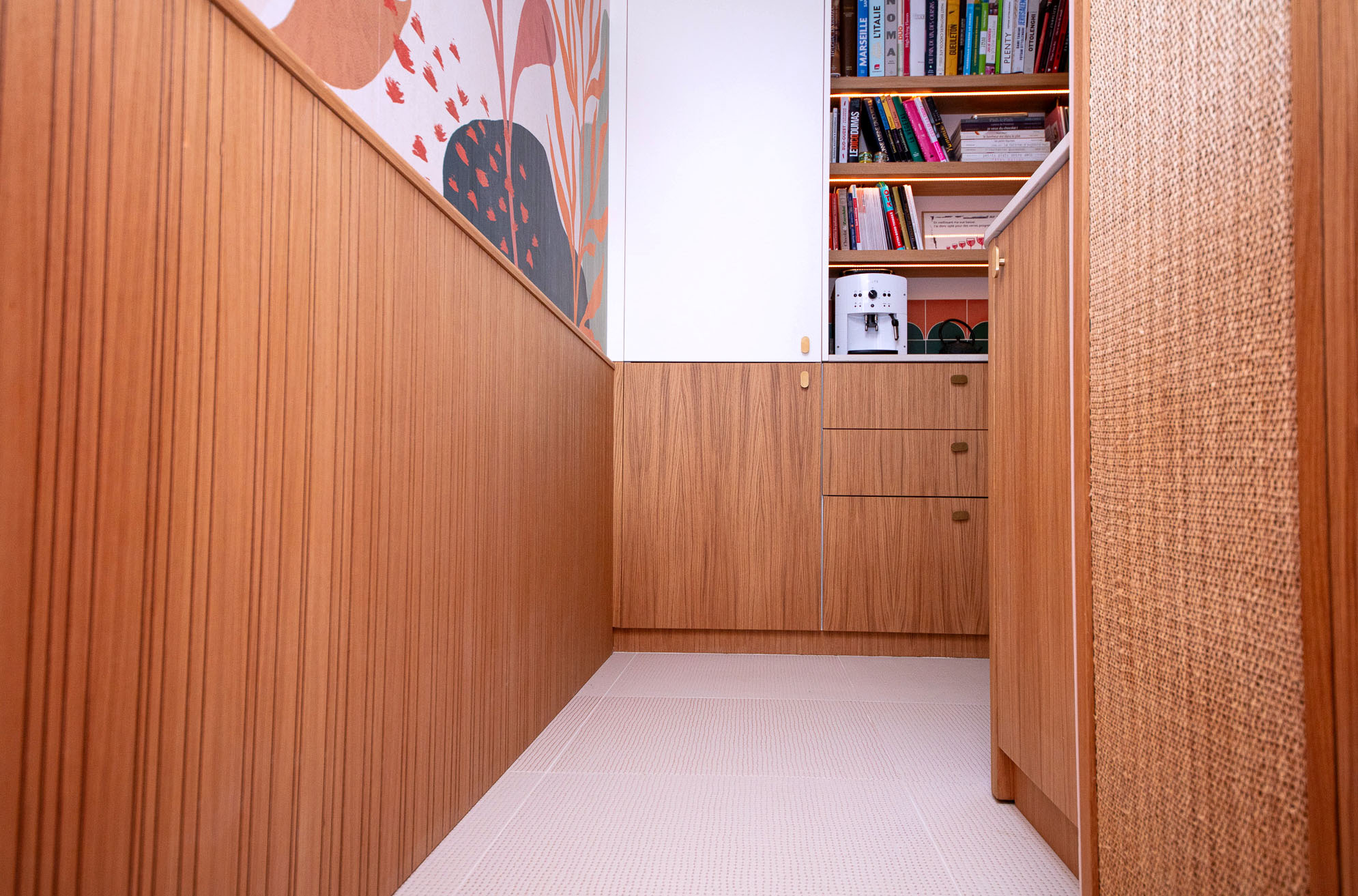 La cuisine a été entièrement refaite sur mesure avec des meubles, un panneau bois strié et une porte de placard en raphia, pour une ambiance chaleureuse et contemporaine.