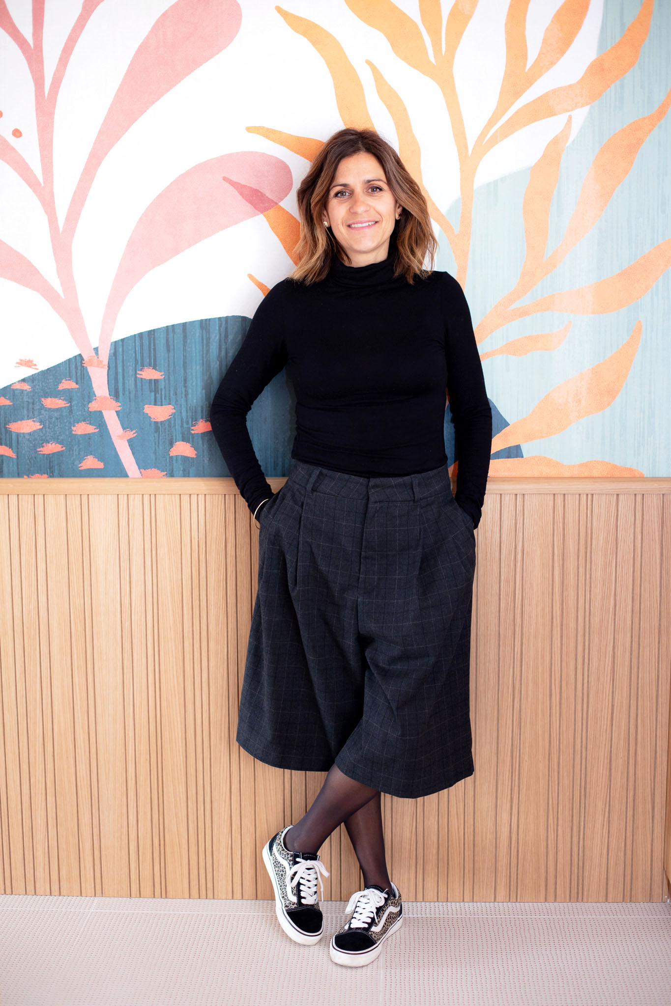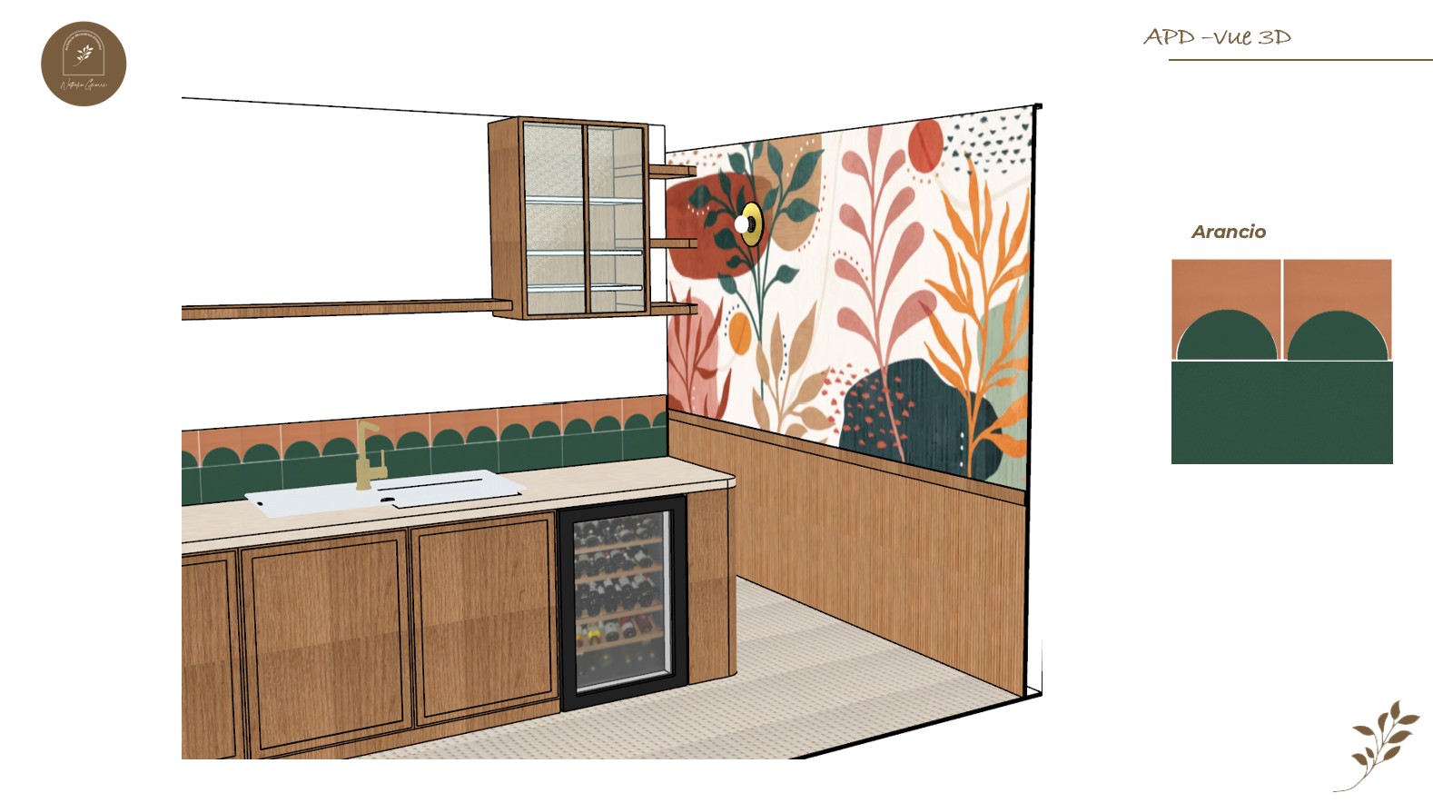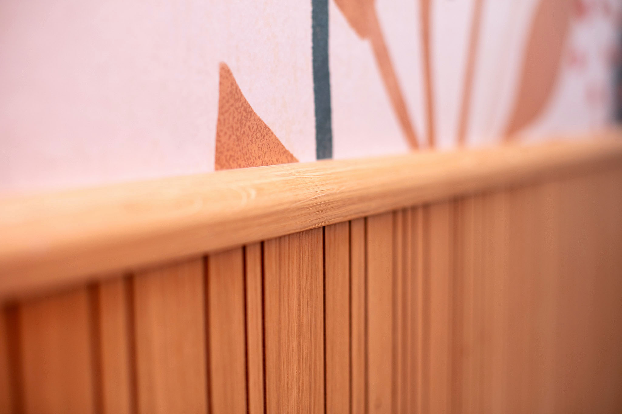 La cuisine a été entièrement refaite sur mesure avec des meubles, un panneau bois strié et une porte de placard en raphia, pour une ambiance chaleureuse et contemporaine.
