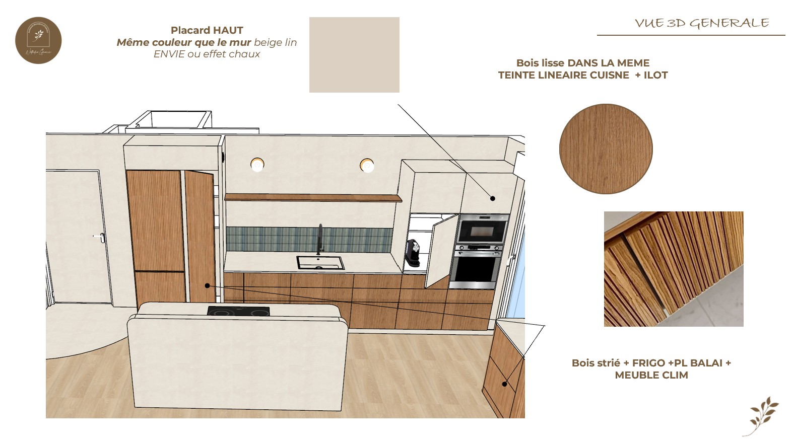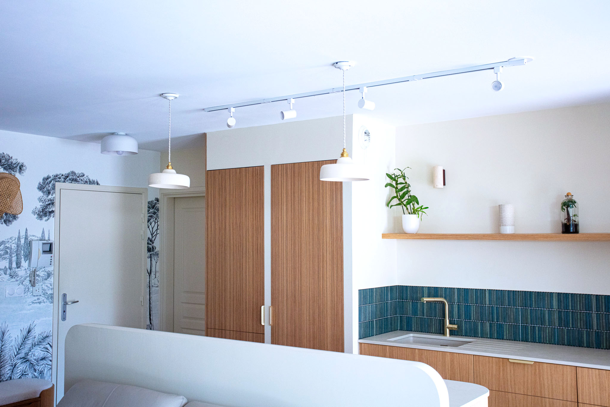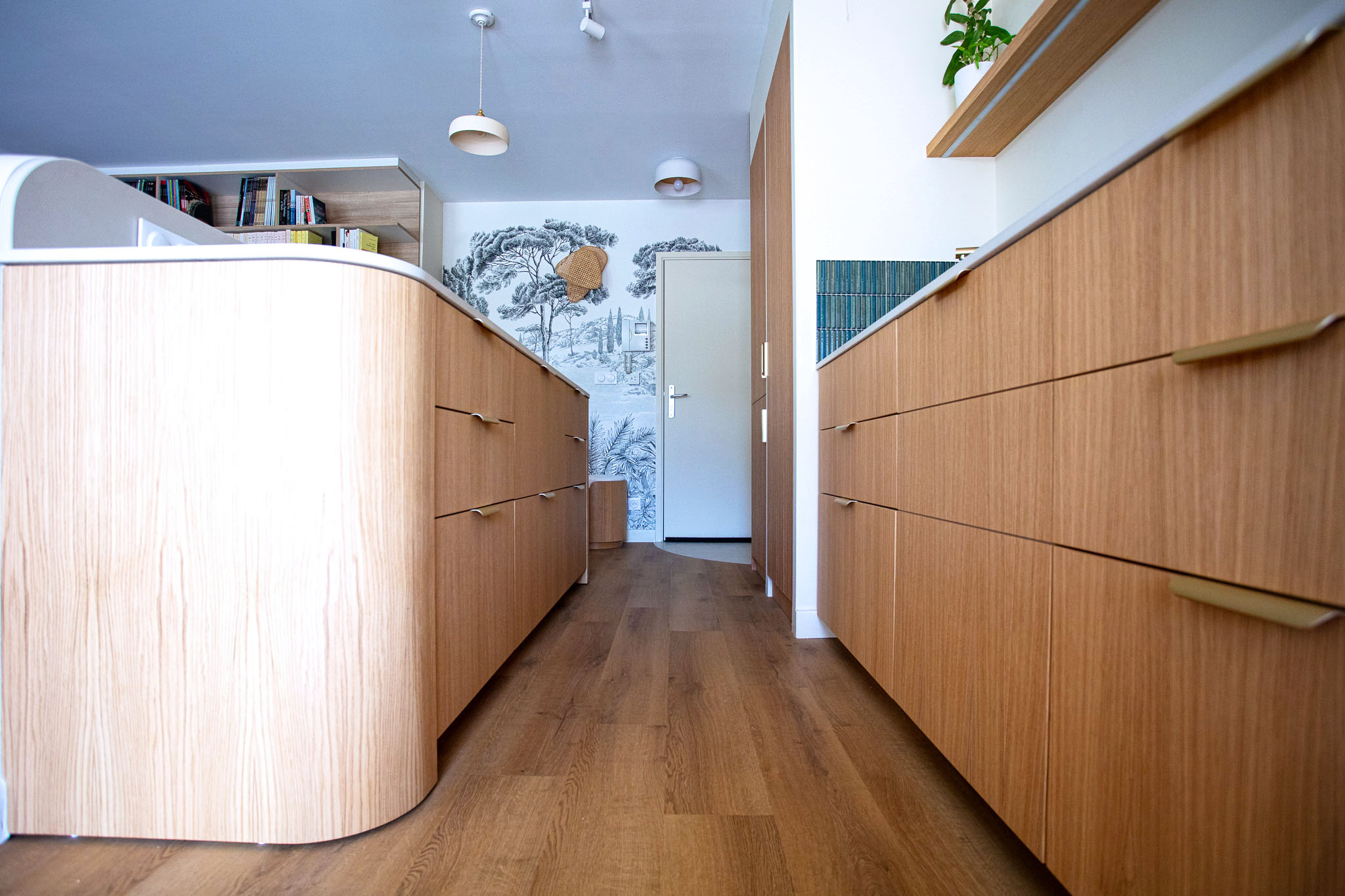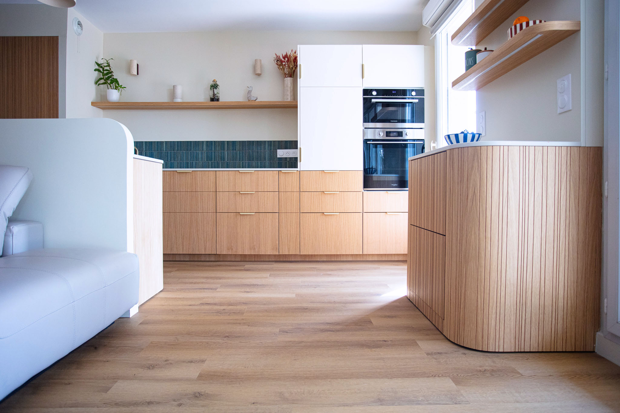Dans ce projet, l'espace cuisine a été entièrement repensé et ouvert sur le salon pour créer un espace de vie fluide et lumineux.