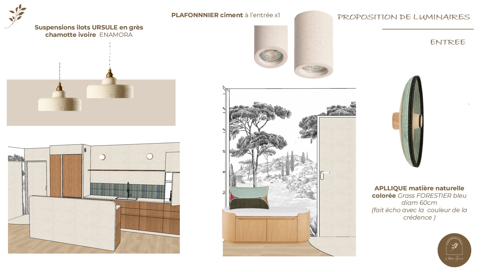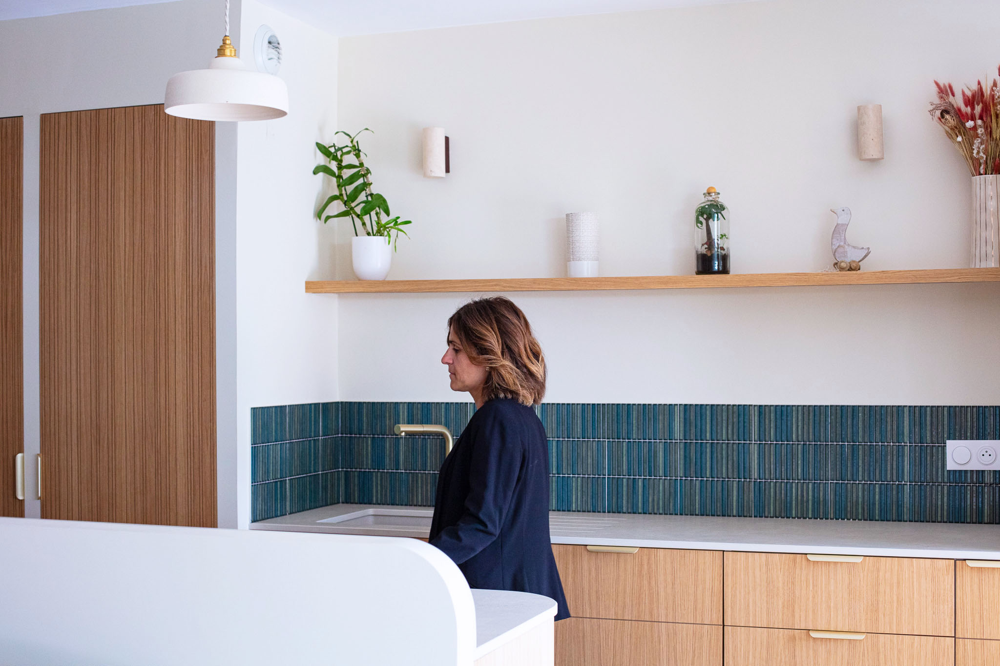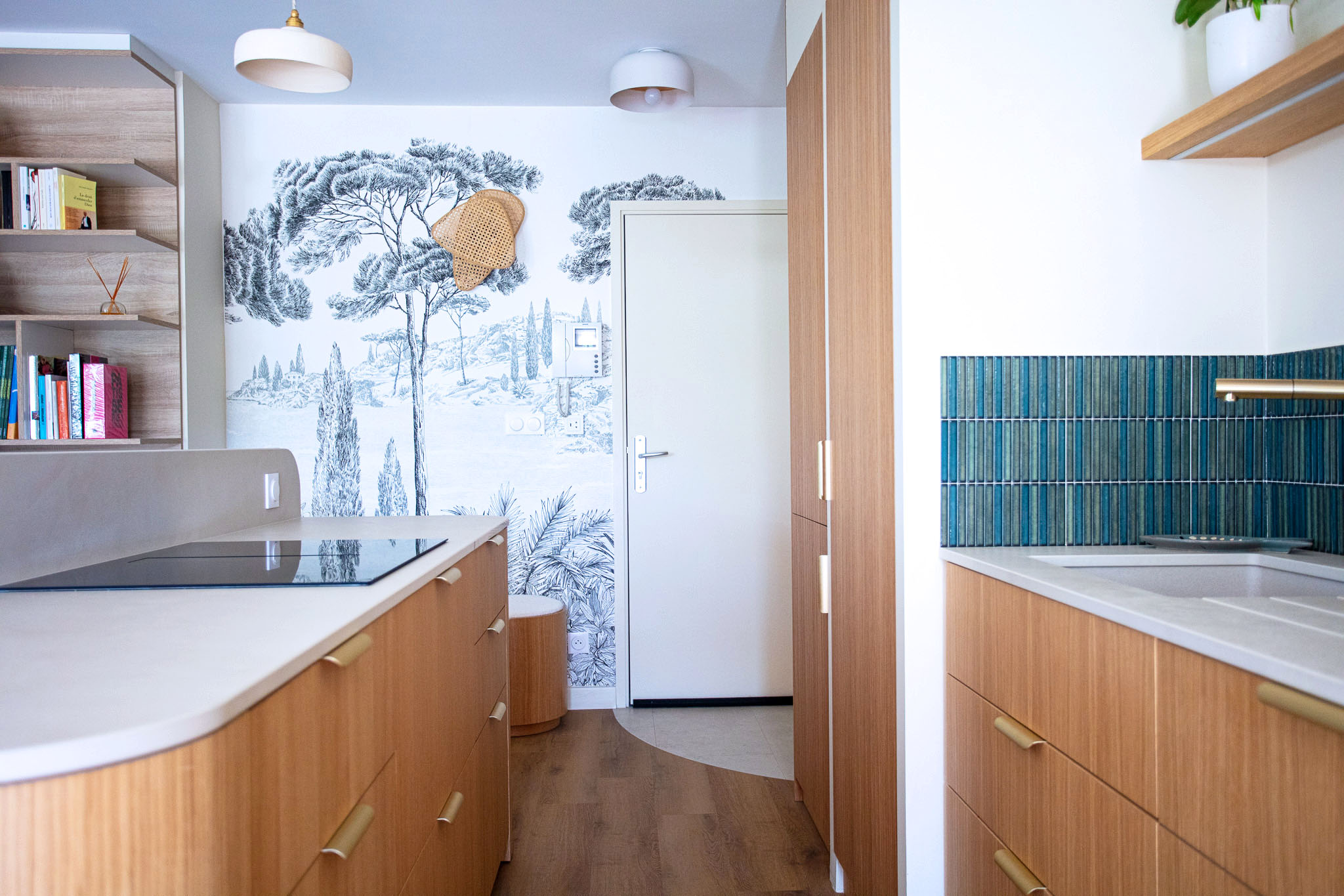 Les matériaux ont été choisis avec soin : plan de travail en Dekton sur mesure, papier peint Isidore Leroy Péninsule, sol contrecollé avec une courbe de transition entre parquet bois et effet béton.