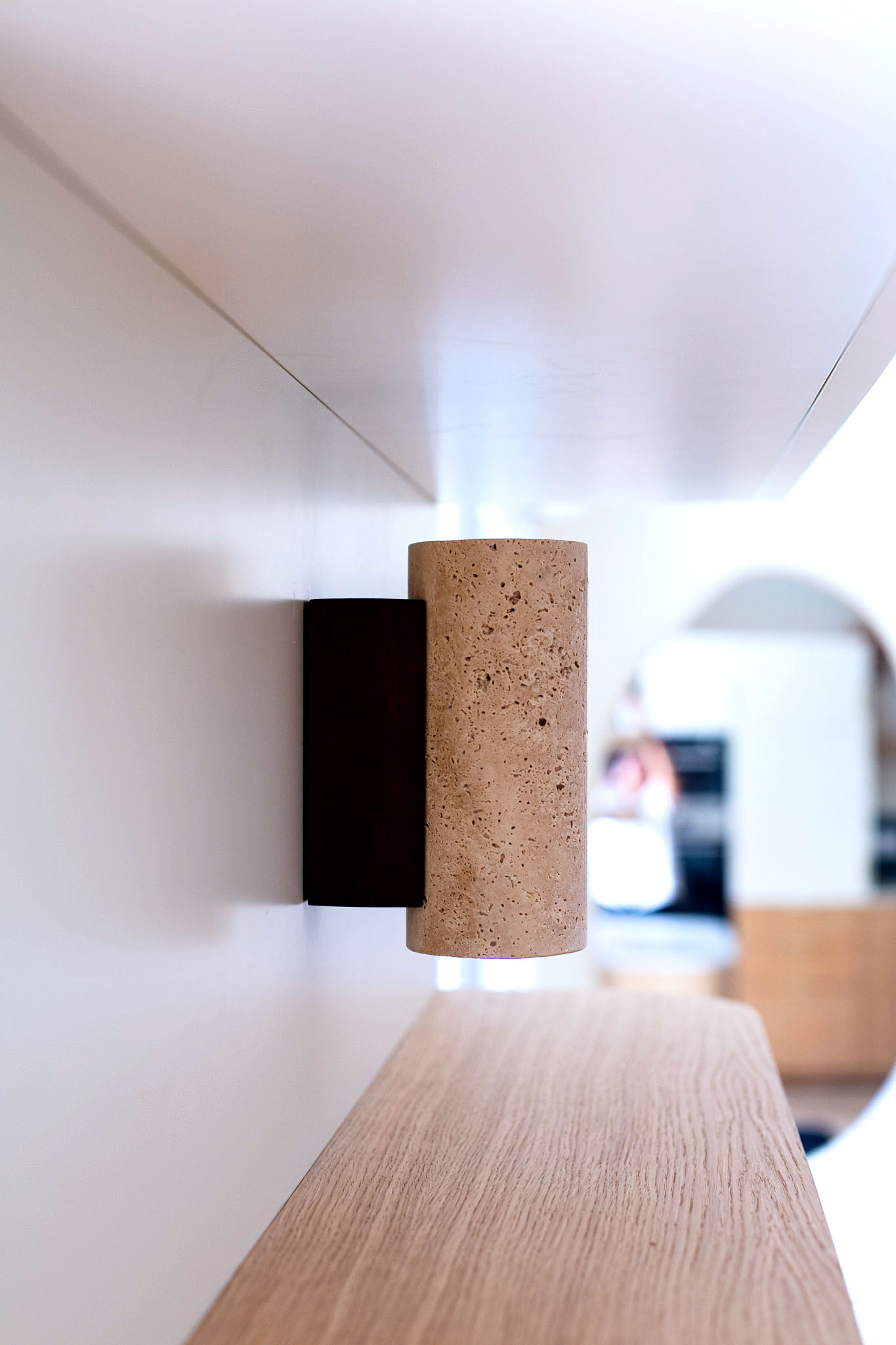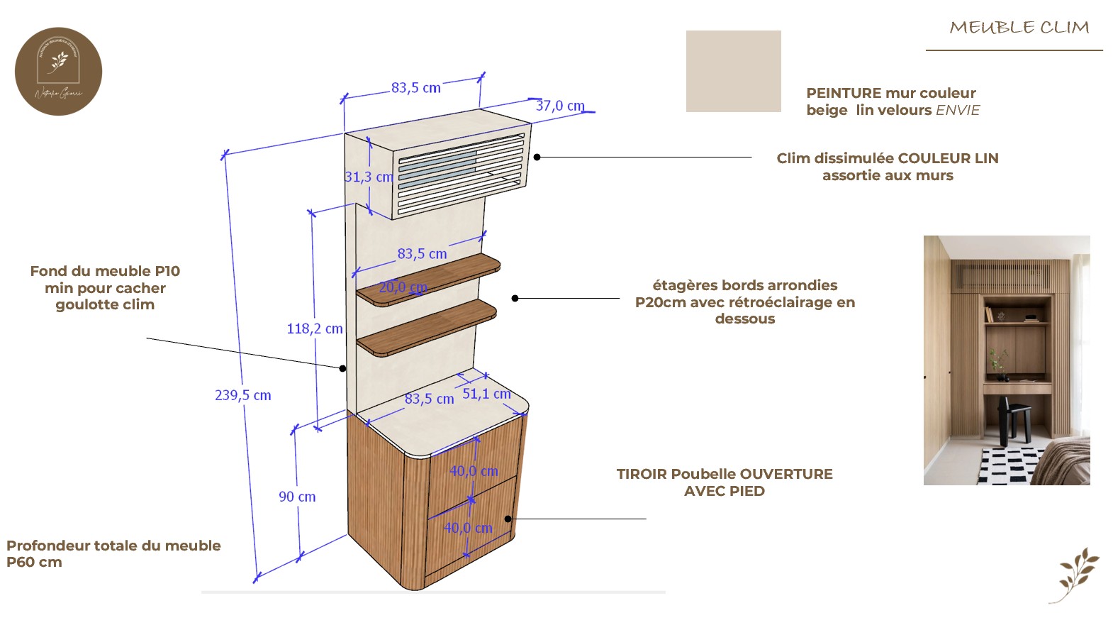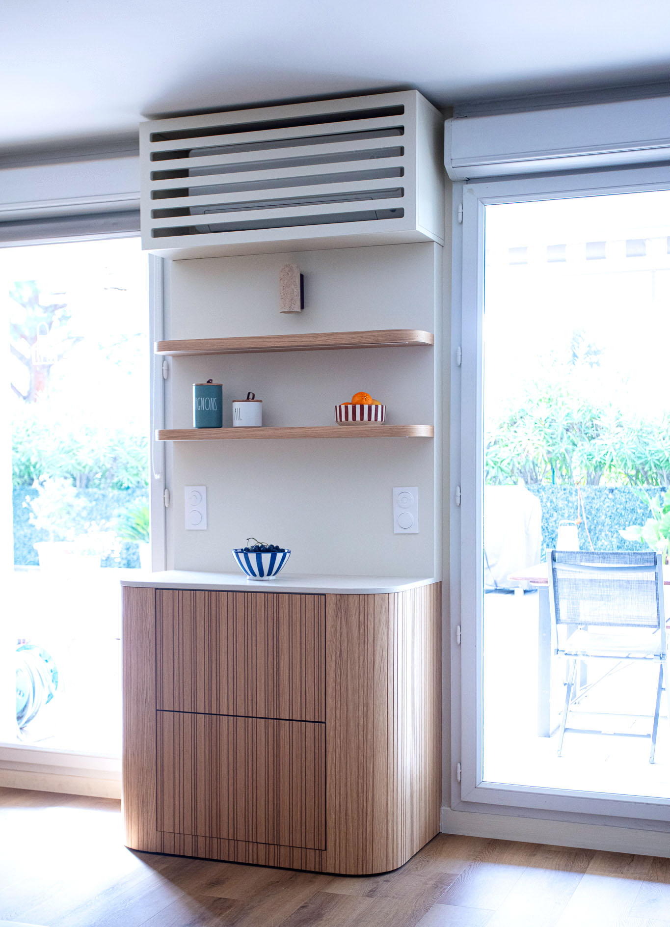 La cuisine est réalisée sur mesure, avec des façades de portes striées et des angles arrondis. Le meuble de climatisation a également été dessiné et fabriqué sur mesure pour s'intégrer harmonieusement dans l'ensemble.